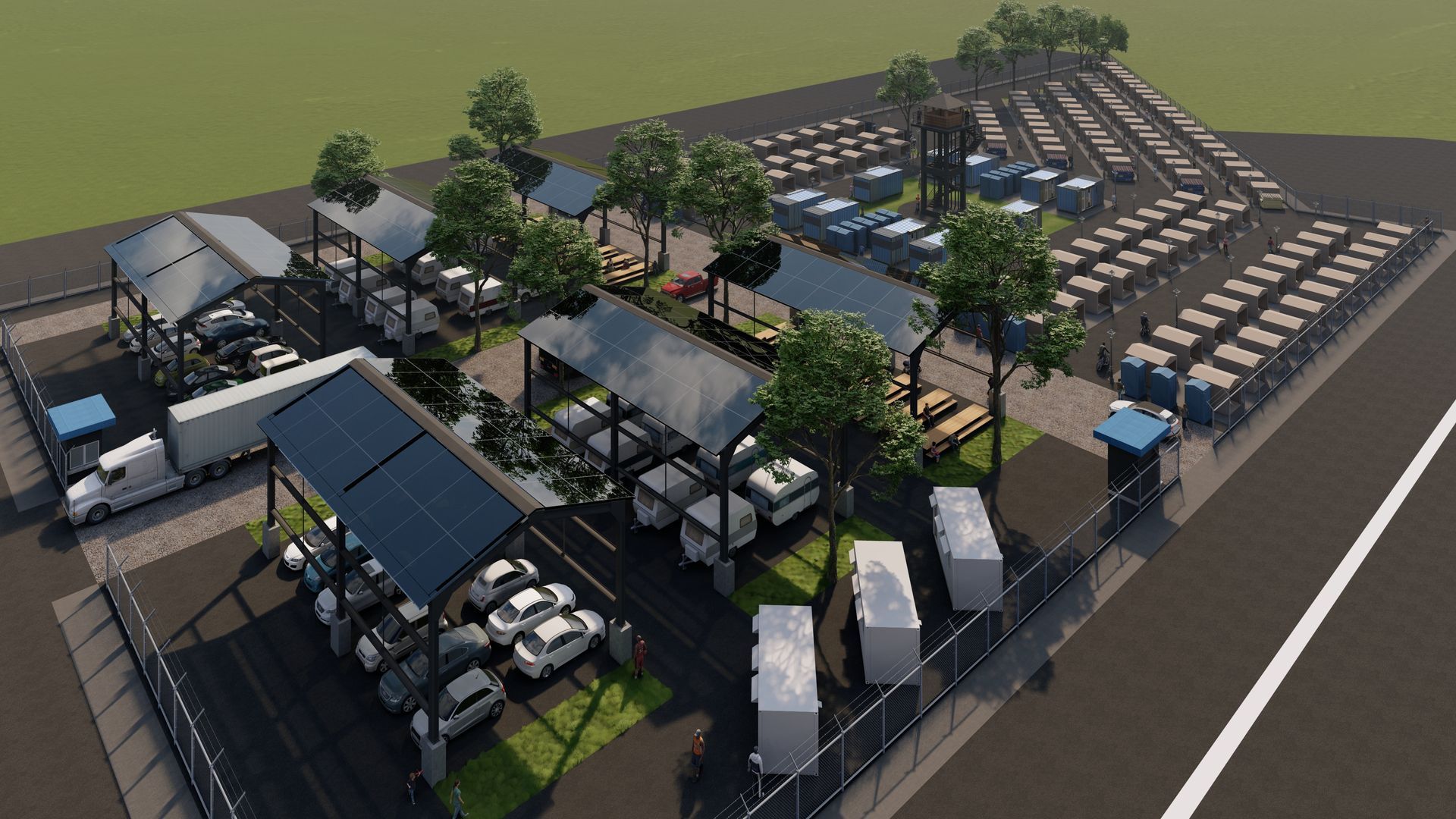 The "open air" designation reflects the project's emphasis on outdoor common spaces, natural lighting, and community interaction areas. Rather than creating an institutional environment, OASIS is designed as a temporary neighborhood with clearly defined private and public spaces. Solar carports and shade structures provide weather protection while generating renewable energy, creating a seamless integration of sustainability and functionality.